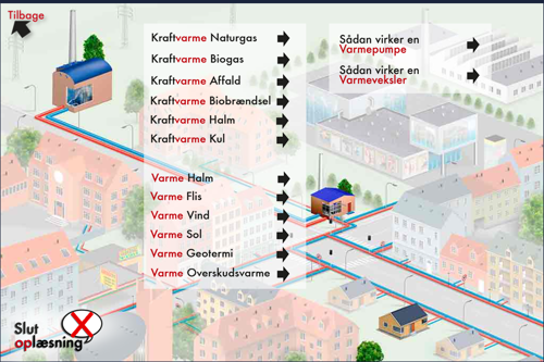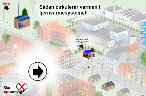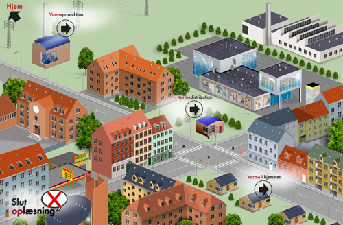 I forbindelse med fjernvarme er der tre trin: varmeproduktion, varmedistribution og varme i hjemmet. Du skal se og bruge animationer af de tre trin i denne aktivitet.