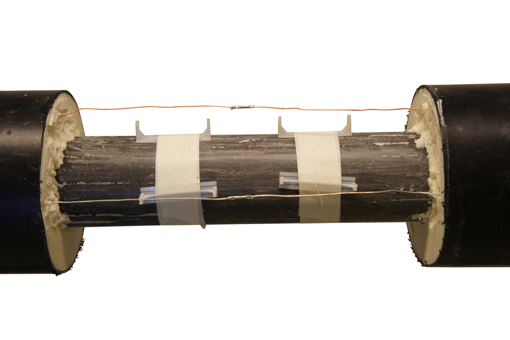 På nyere fjernvarmerør er der såkaldte ”alarmtråde (se de to små metalcirkler på rørene på forrige billede og billedet herunder). Trådene sender automatisk en fejlmelding til fjernvarmeværket, hvis der går hul på et fjernvarmerør.