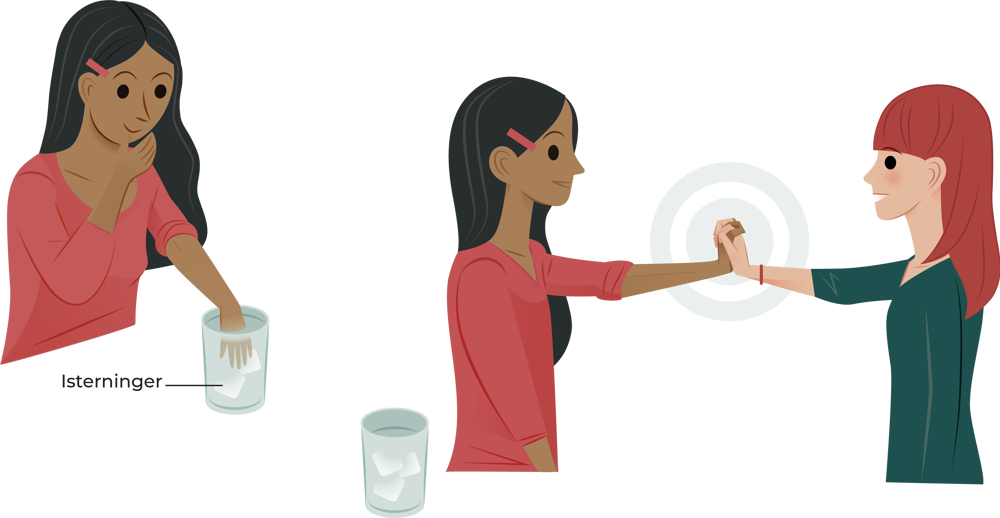 Dernæst skal eleven flette hænder med sin makker. Det er hensigten, at eleverne mærker, hvordan varme kan overføres/bevæge sig/sprede sig fra et sted til et andet.